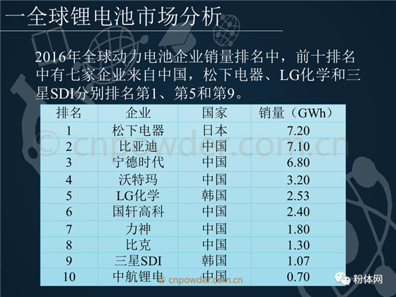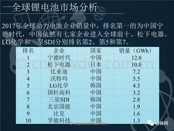 2017年全球動(dòng)力電池企業(yè)銷量中,排名第一的為中國(guó)寧德時(shí)代,中國(guó)依然有七家企業(yè)進(jìn)入全球前十。松下電器、LG化學(xué)和三星SDI分別排名第2、第5和第7。本文詳細(xì)介紹了以上公司的綜合實(shí)力、對(duì)比分析等。